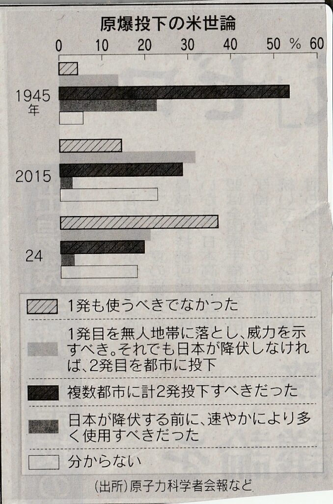 ・「核使うべきでなかった」3割。原爆投下80年 米世論に変化 「一発も原爆をっつかうべきではなかった」とする米国内世論調査の割合は、1945年4%から、2024年36%に上昇した。(日本経済新聞8月6日朝刊)